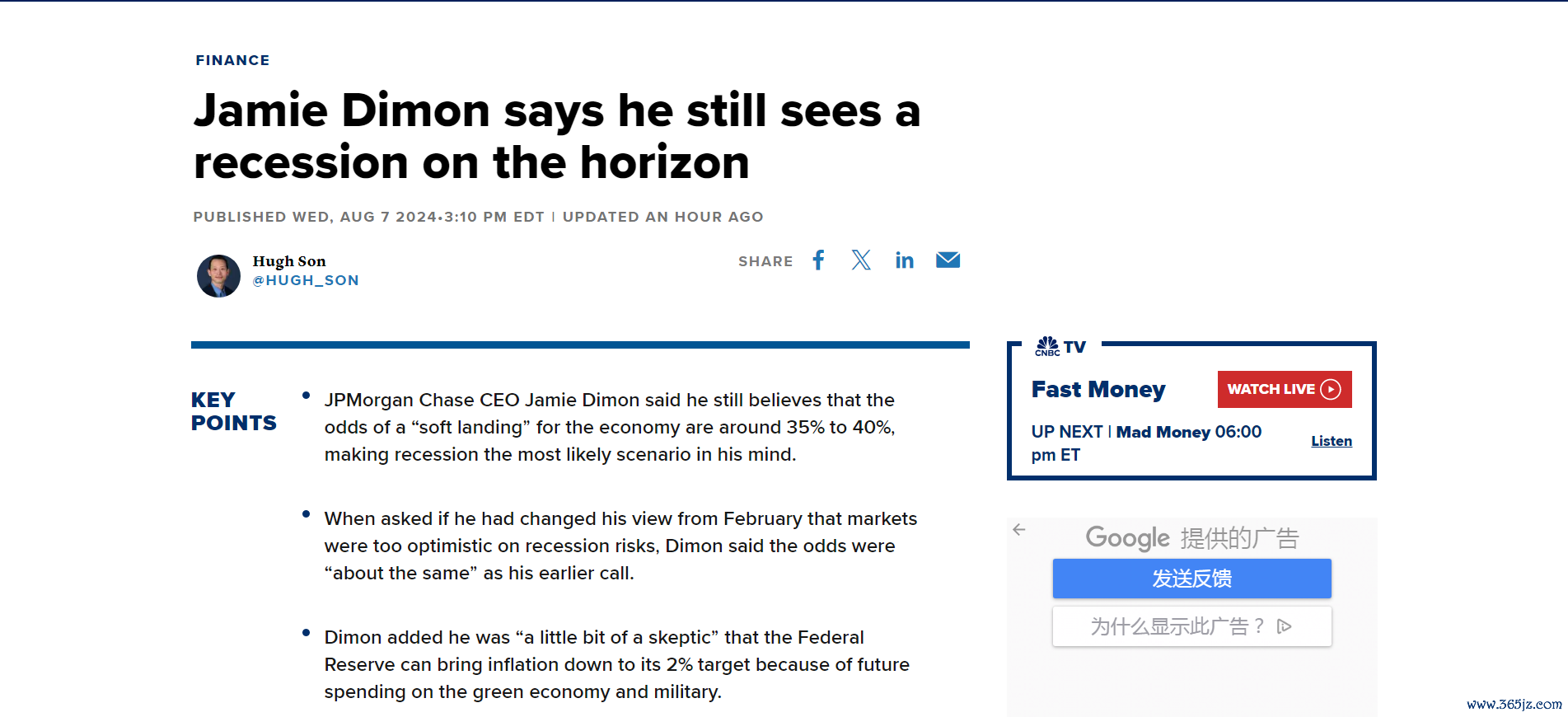 据外媒报道,摩根大通首席执行官杰米·戴蒙周三表示,他依然认为美国经济“软着陆”的可能性约为35%至40%,因此在他看来,经济衰退仍是最有可能发生的情况。