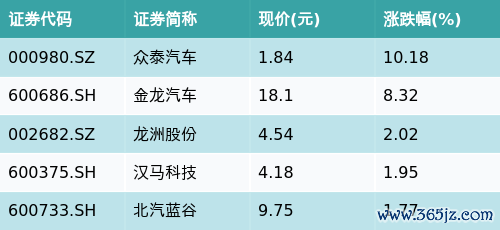 截至收盘专业股票配资公司,汽车整车主题涨跌幅最高的五只股票为:众泰汽车(000980.SZ)、金龙汽车(600686.SH)、龙洲股份(002682.SZ)、汉马科技(600375.SH)与北汽蓝谷(600733.SH)。详情见下表:
