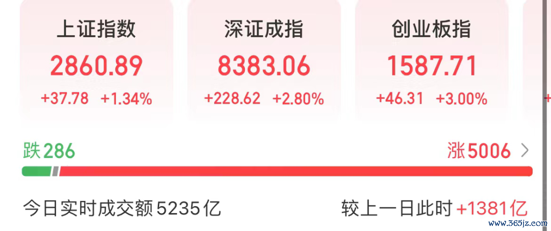 截至上午收盘,上证指数上涨1.34%,深证成指上涨2.8%,创业板指上涨3%。市场成交额为5235亿元,较昨日上午增加1381亿元。逾5000只个股上涨,其中68只个股涨停,没有个股跌停。